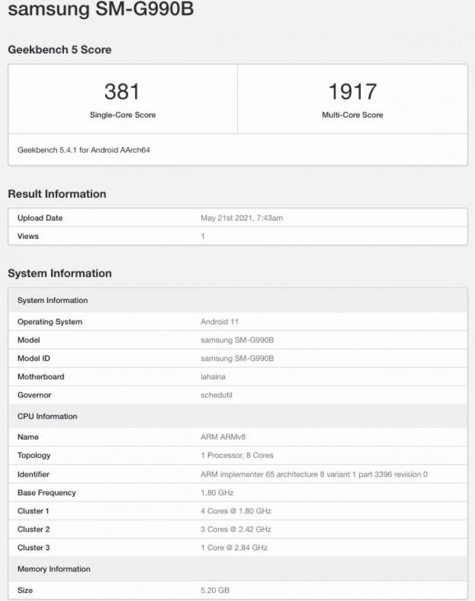 Minulý mesiac sa objavil aj zvláštny záznam v zoznamoch služby GeekBench, ktorá testuje výkon smartfónov a tabletov. Ukázal model SM-G990B, o ktorom experti zistili, že je očakávaný Samsung S21 FE. V zázname o hardvéri zariadenia bolo možné vyčítať, že bude poháňaný procesorom Snapdragon 888, so 6GB RAM a systémom Android 11.